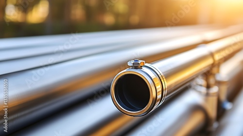 Naklejka premium Close-up of shiny metal pipes with a clamp.