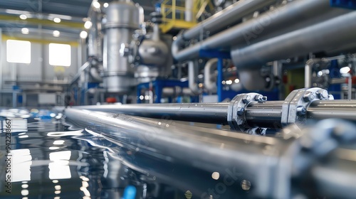 © sablengjago, Fototapeta premium Close up of shiny metal pipes with clamps in a factory setting.