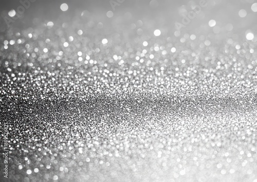 © btiger, Naklejka premium Close-up of silver glitter texture with sparkling bright bokeh lights creating a shimmering pattern
