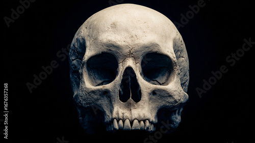 Obraz premium close-up of single human-style white skull with detailed bone texture on deep black background, minimalist helloween with ample blank space