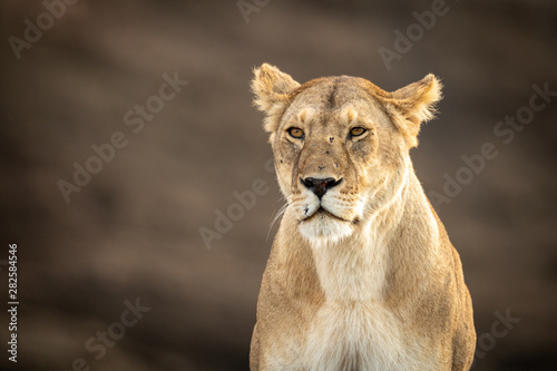 Fototapeta premium Close-up of sitting lioness with scarred face