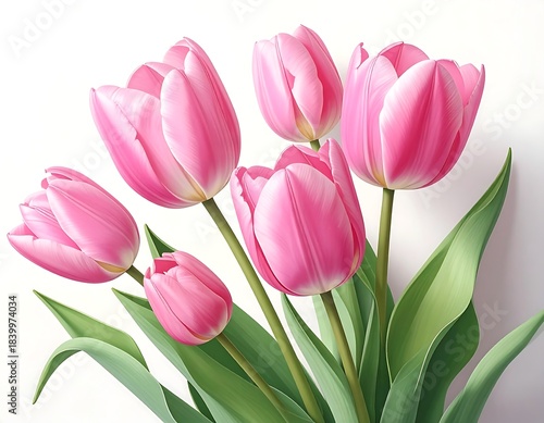 © Prima, Fototapeta premium Close-up of six vibrant pink tulip blossoms against a white backdrop