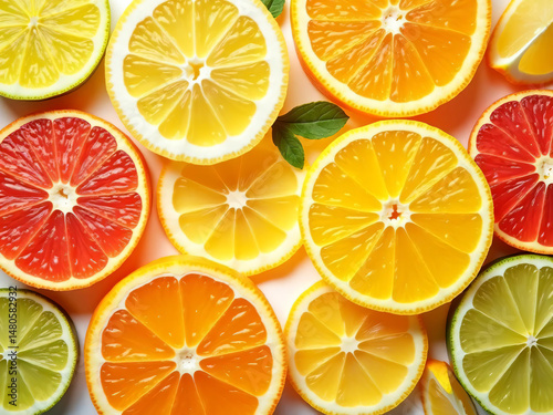 © Tifar, Obraz premium "Close-up of sliced citrus fruits arranged in a flat lay pattern"