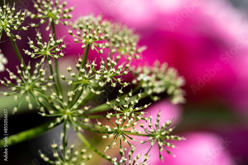 © Ruta K photography, Fototapeta premium close up of small white and green blossoms with pink flowers in the background