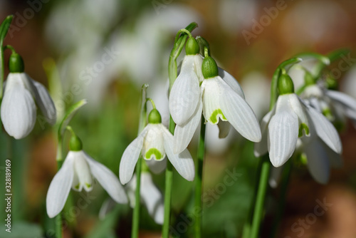© leopictures, Fototapeta premium Close-up of small white snowdrops growing in a meadow in spring in cold weather