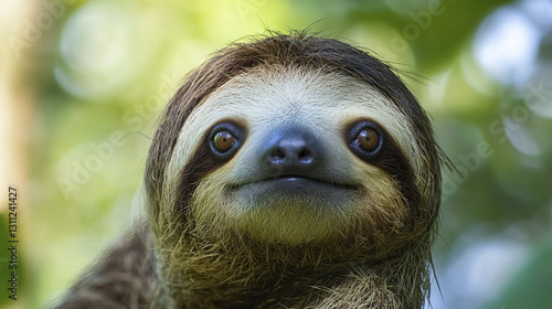 © Thanthara, Fototapeta premium Close up of smiling sloth with perked ears in lush green background