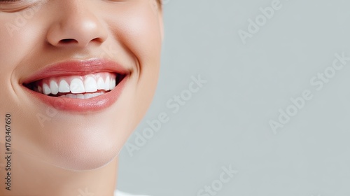 © Matcha_09, Obraz premium Close-Up of Smiling Woman with Perfect White Teeth Against a Soft Gray Background