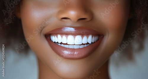 © Sang, Obraz premium Close-up of smiling young black woman showing white teeth, glossy lips, dental, cosmetic care for radiant appearance.