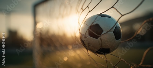 © spyrakot, Naklejka premium Close-Up of Soccer Ball in Net with Sunlit Field Background