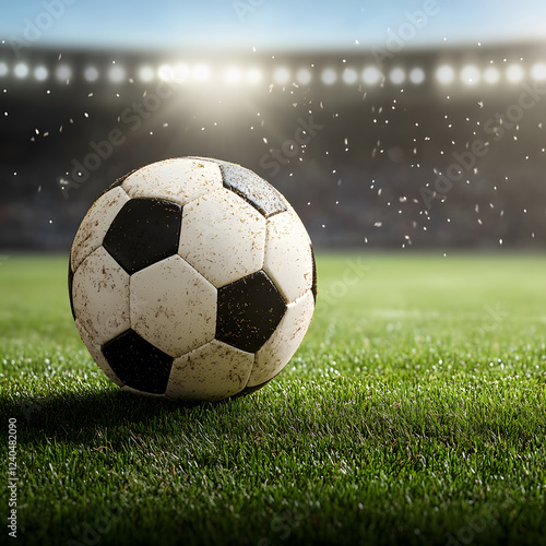 Fototapeta premium close up of soccer ball on grassy field, illuminated by stadium lights