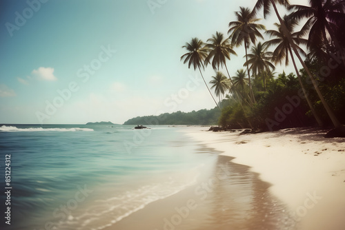 Obraz premium Close-up of soft sand on a tropical beach on a sunny day, with a blurry sea and coconut palm in the background. This idyllic scene captures the essence of a perfect holiday destination.