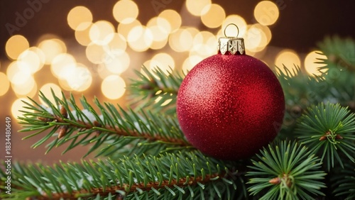 © NN AI, Fototapeta premium Close-up of sparkling red Christmas ornament on fir tree branch. Festive holiday background with golden bokeh lights