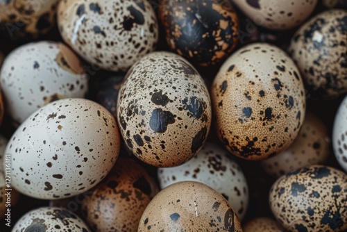© Viktor, Obraz premium Close-up of speckled quail eggs in varied patterns. AI generated