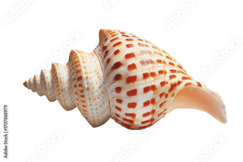 Obraz premium Close-up of spotted conch shell displaying intricate patterns and natural spiral design, cut out