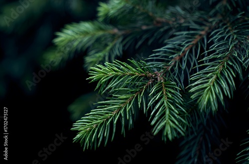 © Prachi, Fototapeta premium Close-Up of Spruce Tree Branches with Needles on Dark Background