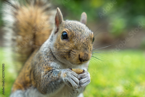 © RichartPhotos, Fototapeta premium Close up of squirrel holing nut with copy space