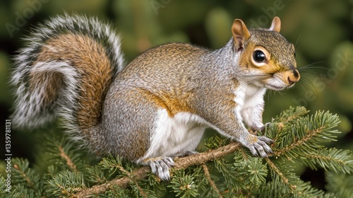 © ryker, Fototapeta premium close up of squirrel perched on evergreen branch, showcasing its fluffy tail and curious expression. This charming creature adds lively touch to natural setting