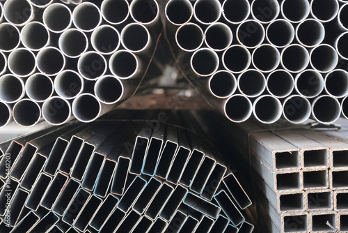 Naklejka premium Close-up of stacked square steel hollow section profiles and round steel...