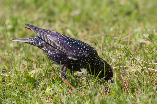 Fototapeta premium close up of starling searching for food in ground