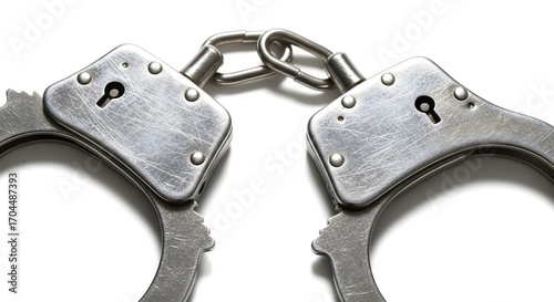 © Robert Garcia, Obraz premium Close-up of Steel Handcuffs Locked Together on White Background for Crime Justice Legal Concept Illustrations