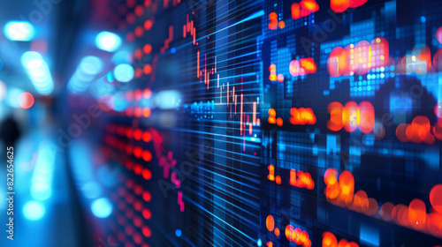 © khonkangrua, Fototapeta premium Close-up of stock market data displayed on a digital screen with colorful lights and charts in the background.