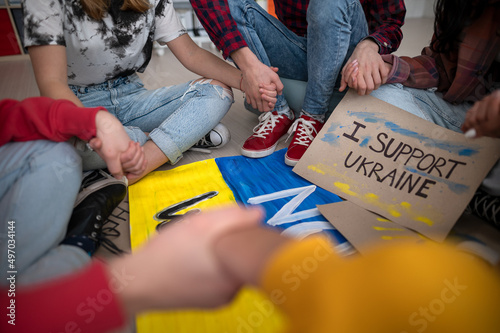 © Halfpoint, Obraz premium Close-up of students praying for Ukraine at school.