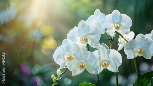 © Lasvu, Fototapeta premium Close-up of stunning white Phalaenopsis orchids. Tropical Orchidaceae plant.