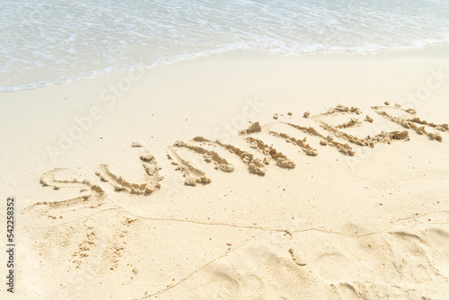 Fototapeta premium Close-up Of Summer Text Written On Sandy Beach Near The Seashore. Beach and...