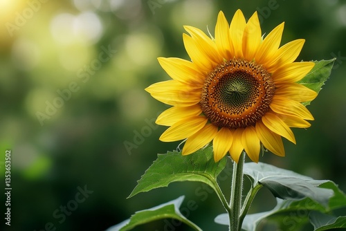 © Stanislav, Fototapeta premium Close-up of sunflower with seeds, vibrant yellow petals, dark center, green leaves. Concept of sunflower with seeds and farming, creating serene atmosphere with soft light.
