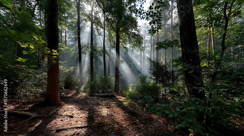 © GreenOptix, Naklejka premium Close-up of sunlight filtering through dense forest canopy, illuminating green leaves and tree branches. Tall tree trunks with textured bark and fallen leaves on the ground. Interplay of light and sha