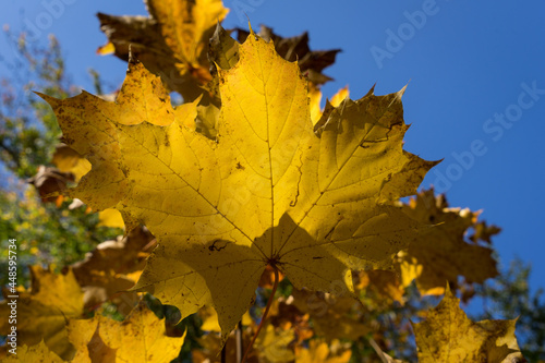 © Adria, Fototapeta premium close-up of sunny golden maple leaves in the magical autumn forest