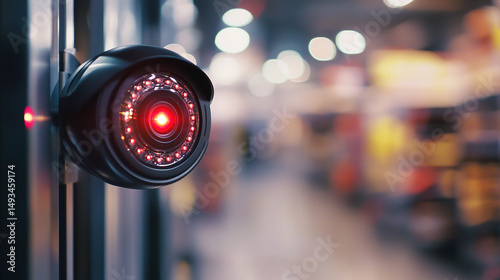 Obraz premium Close-up of surveillance camera with blinking red LED light monitoring retail...