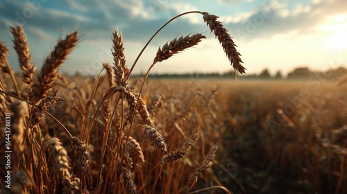 © Kitsada, Obraz premium Close-up of tall golden wheat stalks swaying in the breeze du sunrise in a vast agricultural field with a clear sky and lush landscape background