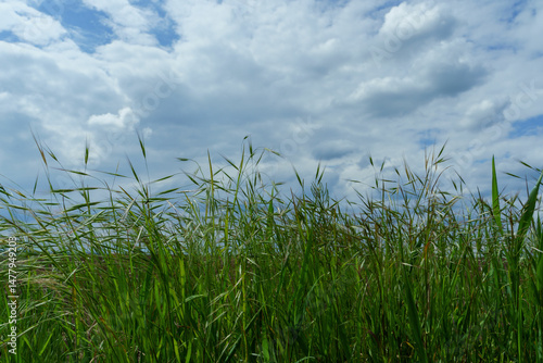 © dddoria, Fototapeta premium Close-up of tall green grasses on the field with cloudy sky on the background