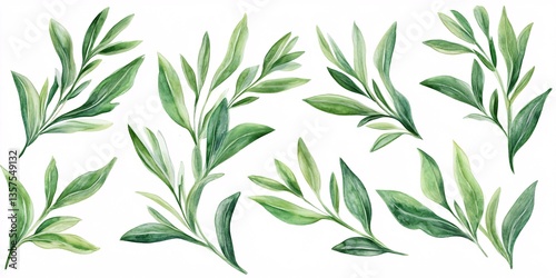© Rostyslav, Naklejka premium Close-up of tarragon leaves emphasizing fine veins against white backdrop