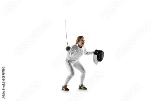 Obraz premium Close up of teen girl in fencing costume with sword in hand isolated on white...