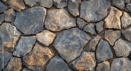 © olegganko, Fototapeta premium Close-up of textured stone wall featuring various shapes and colors in natural light
