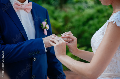 Fototapeta premium Close-up of the bride placing the wedding ring on the groom's finger during their wedding ceremony outdoors.