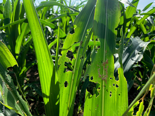 Fototapeta premium close up of the corn bitten leaves in field