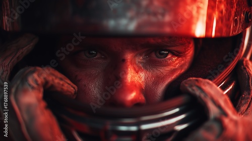 Naklejka premium Close-up of the driver putting on gloves, adjusting his helmet strap, taking a deep breath, the racetrack reflected in his visor, intense emotions.