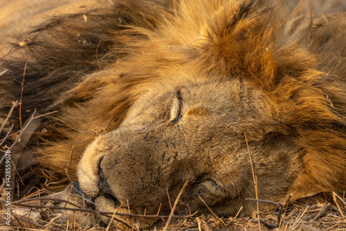 Naklejka premium Close up of the Head of a Large Sleeping Lion With a Thick Mane in South Africa