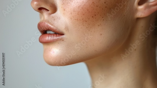 © Ghiska, Obraz premium Close up of the neck and chin area of a woman in her late fifties with some wrinkles around her mouth.