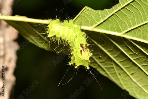© Xiangli, Naklejka premium Close up of the old larvae of the green tailed silkworm moth (Bombyx Mandarina) inhabiting wild plants