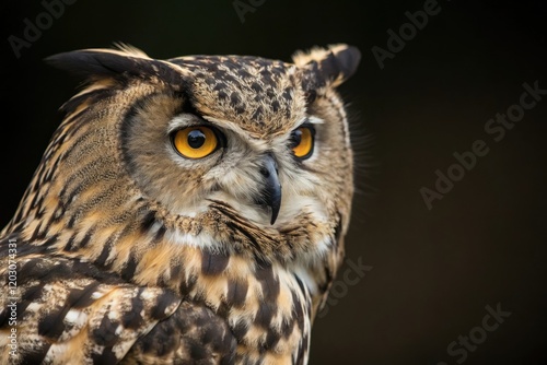 Fototapeta premium Close-up of the owl's face with sharp eyes staring directly into the camera, great horned owl features, beak shape, closeup portrait, animal eyes, bird behavior