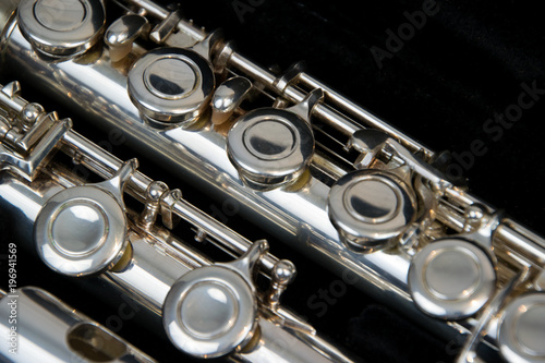 © Nikole Kelly Hill , Naklejka premium Close up of the silver plated musical instrument flute