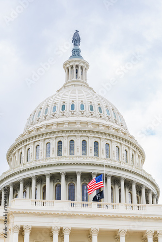 Fototapeta premium Close-up of the U.S. Capitol dome with American and POW flags flying at half-staff.