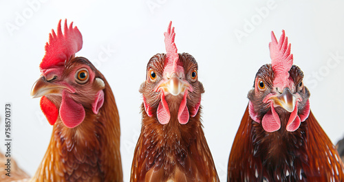 © Maksim, Naklejka premium Close up of three brown chickens isolated white background, funny farm animal portrait
