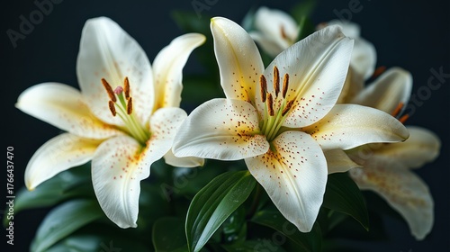 © afif, Fototapeta premium Close-up of three cream-colored lilies with dark-spotted details on a dark background
