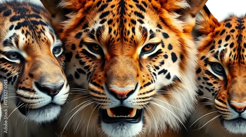 © Rashmi, Fototapeta premium Close up of three jaguars with intense gaze and spotted fur patterns in a striking composition