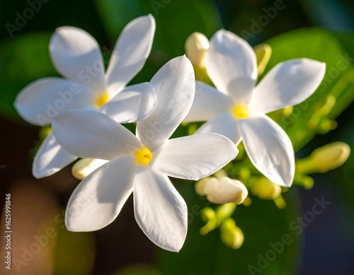 © telo, Fototapeta premium Close-up of three pristine white flowers with yellow centers, backlit, showcasing delicate petals and subtle shadows